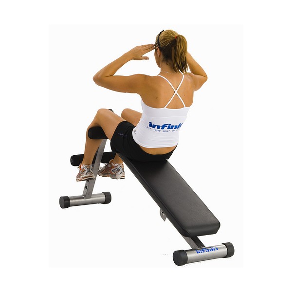 Fully adjustable bench from decline to flat. 8 adjustment levels. 2 leg rest adjustments. Premium extra thick padding with embossed upholstery and metallic paint finish. Heavy duty oversized tubing. Folds for easy storage.